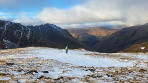On day three, our plan was an ascent of Beinn Fhada, 1032m (meaning long mountain). The weather was forecast to be dry and sunny at times. The day began with a pleasant two-hour walk into a beautiful corrie, with big cliffs and buttresses. The next step was an ascent, up another good stalker’s path, to a plateau and the snowline. The views on the plateau were fantastic. The snow line was at about 800m. To the southeast lay the Five Sisters of Kintail, and to the northeast the mighty Affric hills. What a tremendous hill. We lingered on the summit for a while, then began our three-hour walk back to the start. Altogether, the hill took us seven and a half hours.