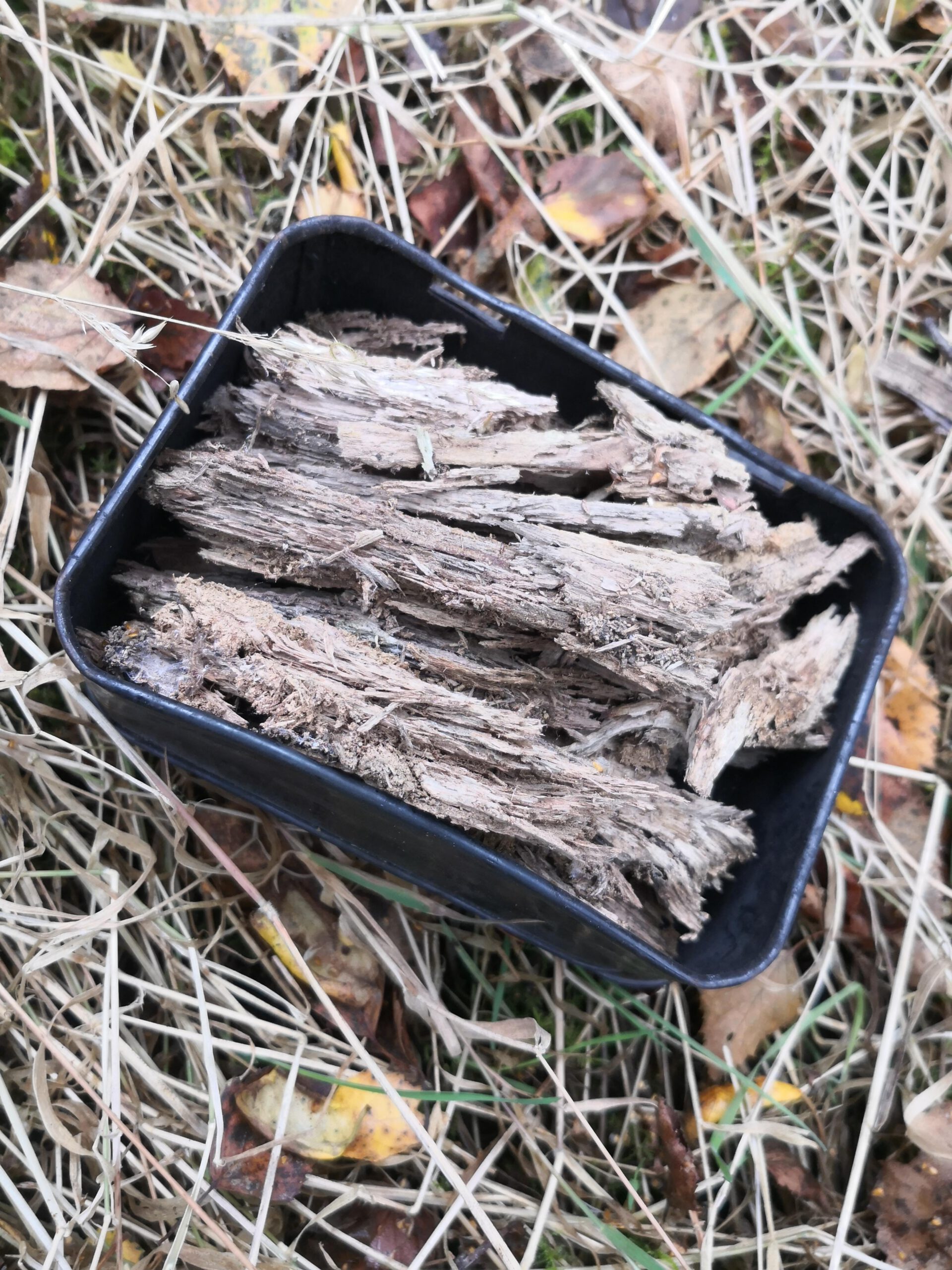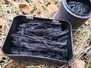 Having collected the punk wood, you need a tin, any sort will do as long as it has a lid. Pierce a small hole in the lid of the tin using a nail. Next, fill the tin with punk wood and close the lid. After that, place the tin on a fire. Before long, the charring process starts, and smoke begins to come out from the small hole. Keep an eye on the smoke, and once it lessens and goes out (about 10 minutes), carefully lift the tin out from the fire and leave it to cool. Don’t be tempted to lift the lid off too early. If you do, exposure to oxygen will lead to combustion, and your charred punk wood will ignite. Once cool, however, you can take the lid off to reveal the charred punk wood. Now it’s ready to take a spark from a fire striker. Even a weak spark will create an ember, which can then be placed into a tinder bundle (for example, purple moor grass) and blown into a flame.