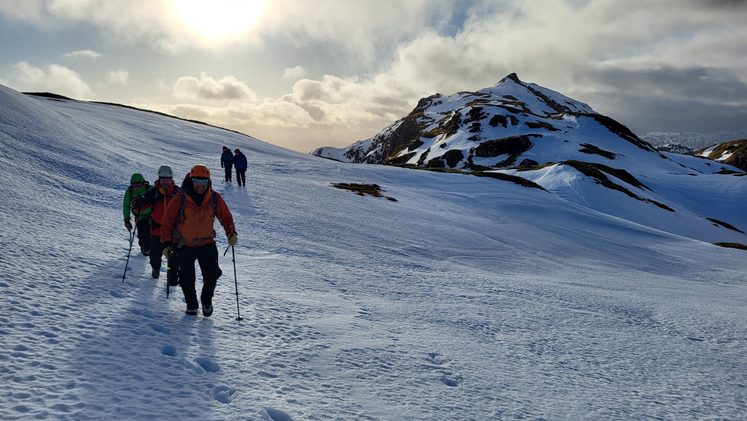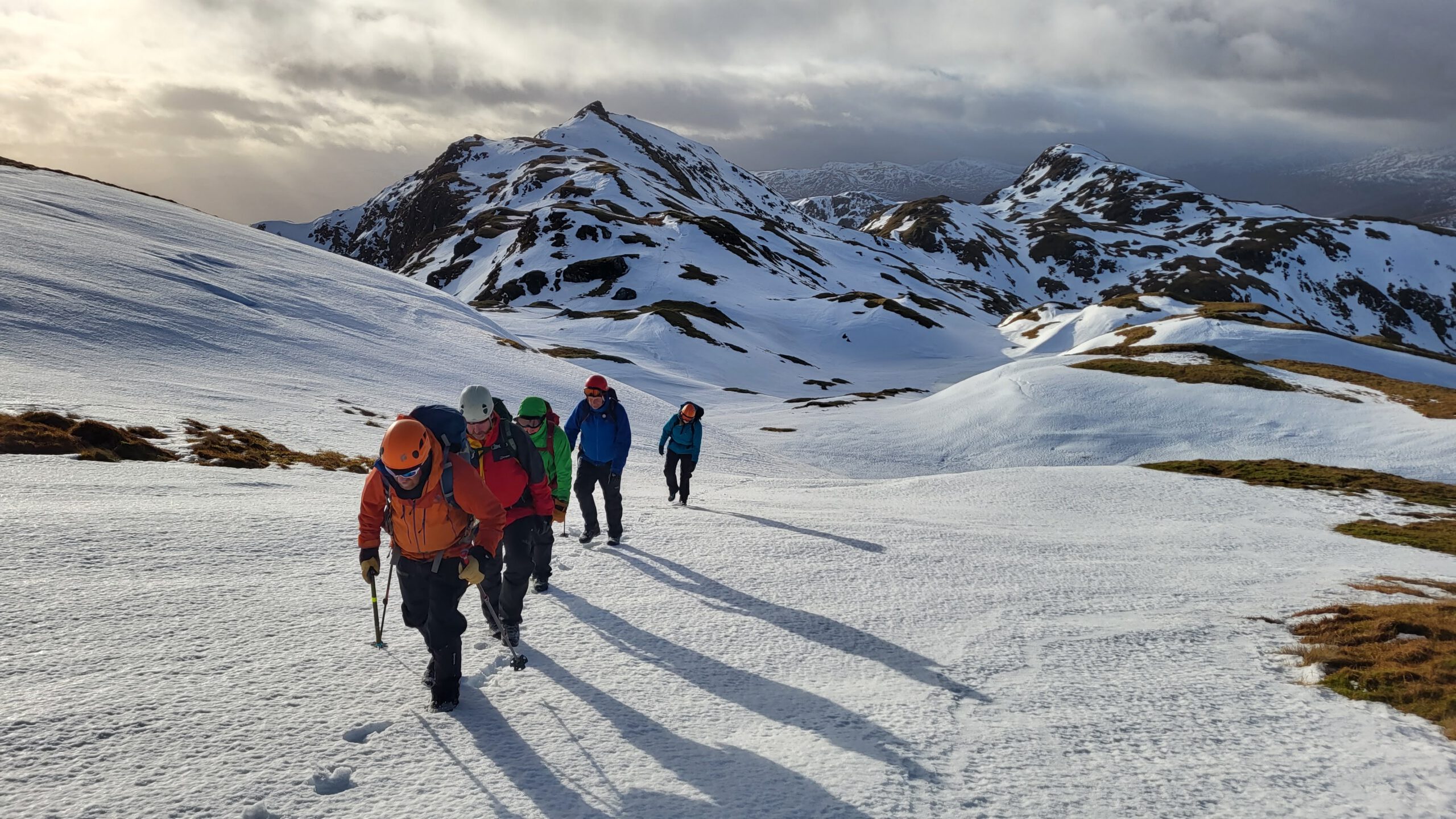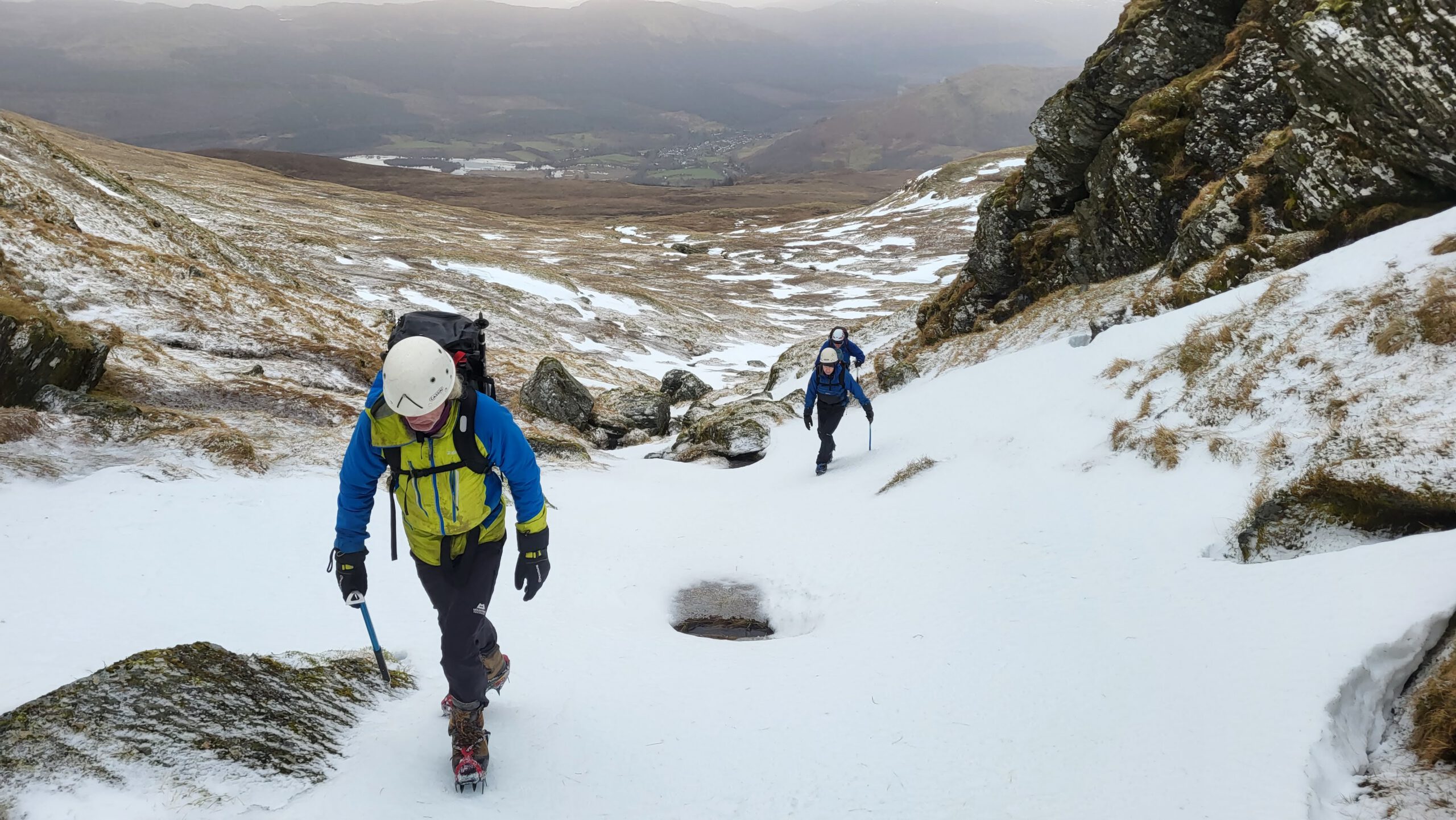 Throughout much of February, the snowpack has been well consolidated. This means it forms a compact, homogenous layer of well-bonded snow. When frozen, the snow becomes hard, and crampons become essential for safe travel. Tripping up on hard snow like this can lead to alarming slides and what’s termed long run-outs, meaning you slide for a long way and quickly, presenting the risk of bashing into rocks and hurting yourself. Well-consolidated hard snow, also, however, also affords the winter hill-walker delightfully enjoyable ground for walking. Rather than painstakingly post-holing through deep snow, one can walk easily and efficiently through the landscape. Conditions like these also present excellent conditions for ascending snow slopes, including easy snow gullies. Meall Garbh on Meall nan Tarmachan has a few short and straightforward grade 1 winter gullies (Easy gully, for example – see below) that make for an enjoyable and exciting adventure. With clients this February, we found easy angled slopes to develop skills, longer snow slopes for practicing journeying skills, before progressing onto our grade 1 easy gully.