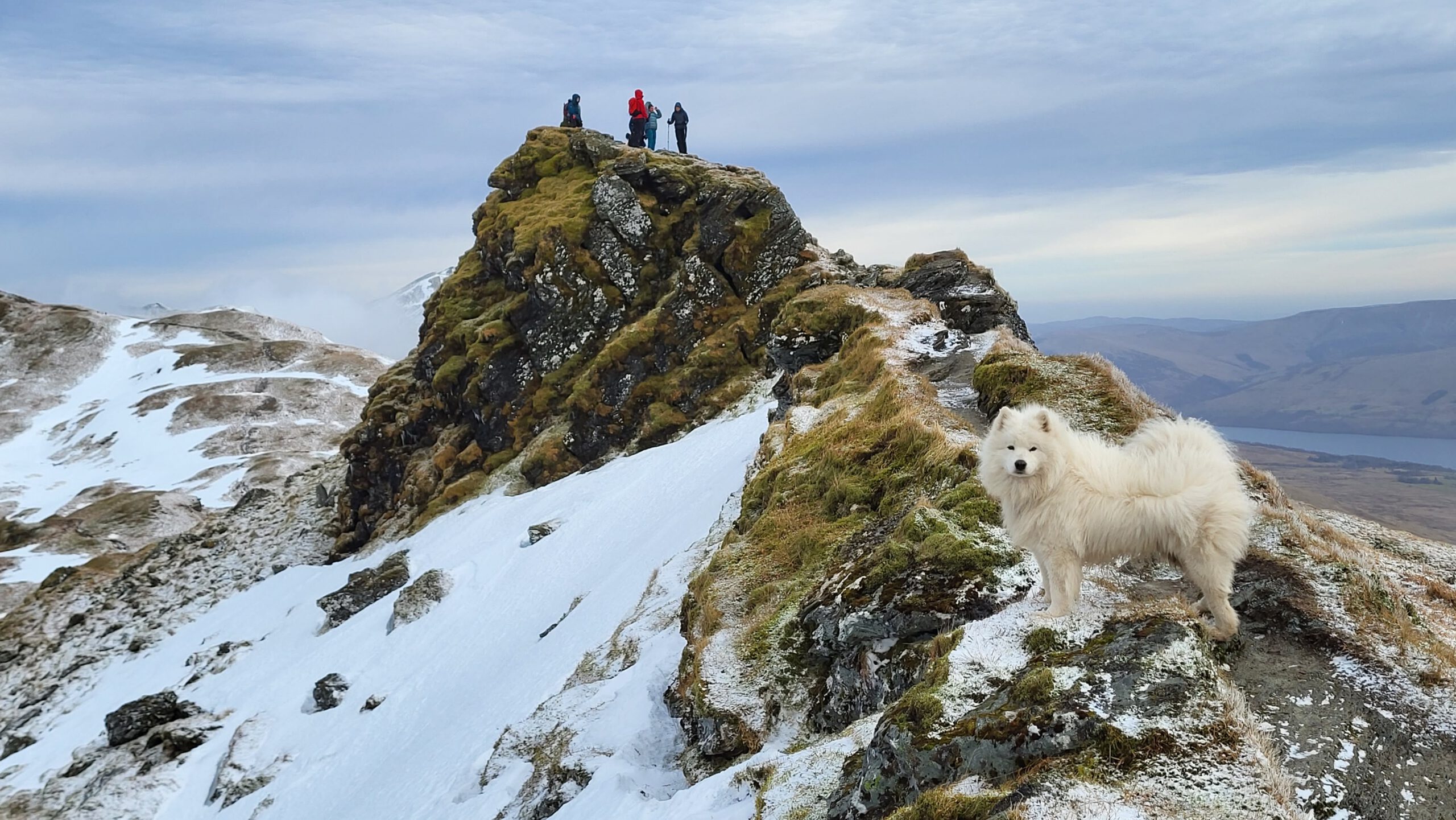 All the while, on our winter journey, we were accompanied by Alan’s dog Mishka, a Samoyed. This breed of dog comes from Siberia and has a dense, warm coat and hair on the base of its feet to afford it lots of grip. It went without saying that Mishka breezed along the ridge with ease. If you’d like to join us for a winter’s day hill walk, or for some winter skills training, please get in touch.