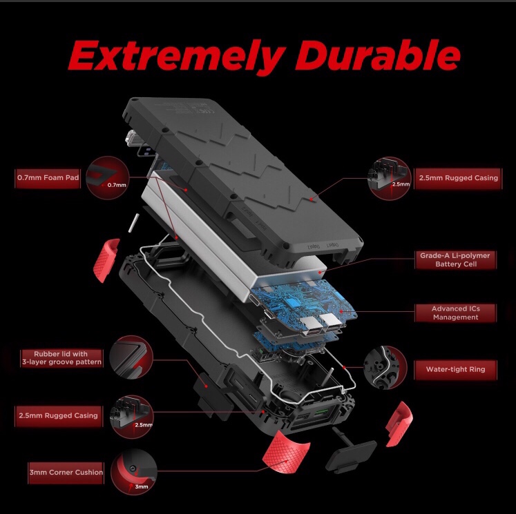 Water-resistant and Durable: the powerbank is encased in silicone rubber with rubber caps covering the USB and charging ports, making it water resistant, shock proof, dustproof and generally a really strong, robust bit of kit, well suited to the outdoors.