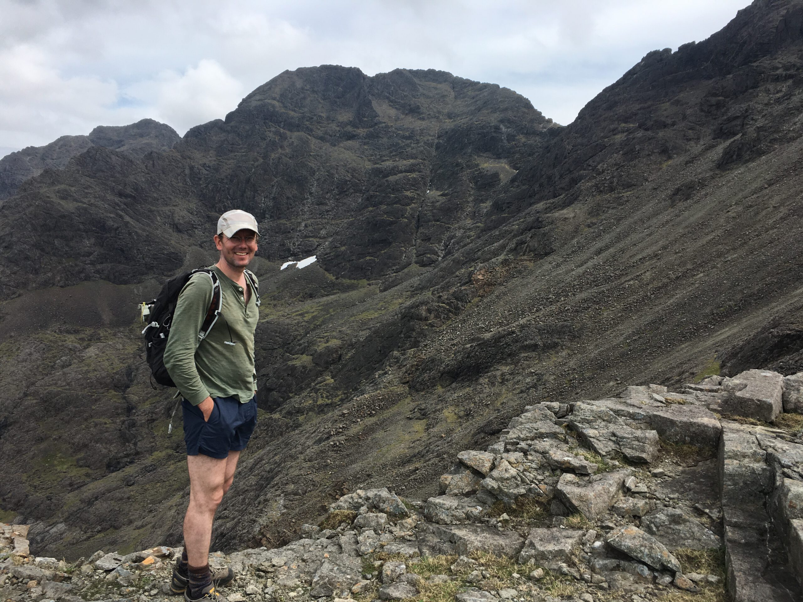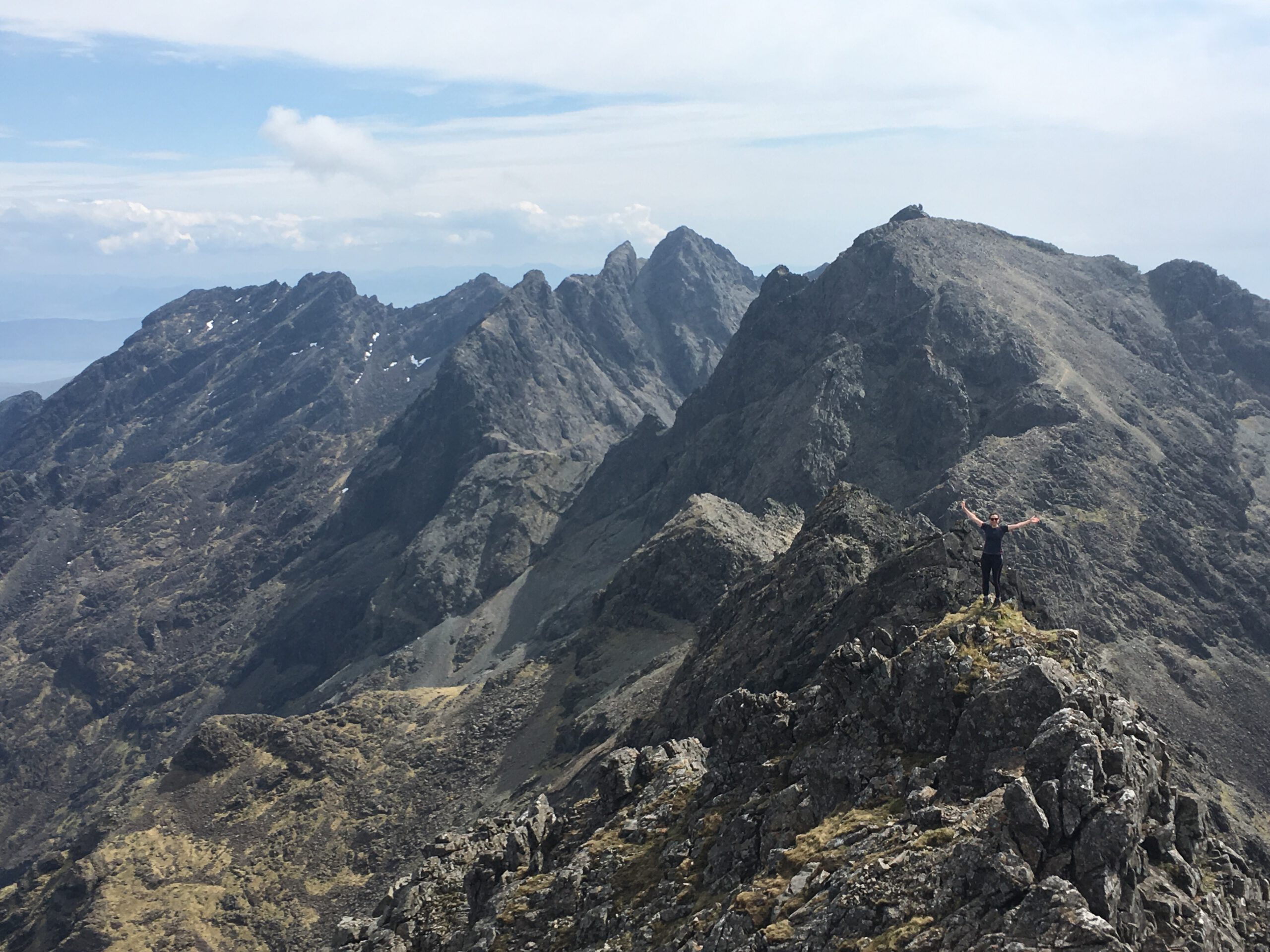 Sgurr na Banachdaich is a 965m mountain on the Cuillin Ridge, the most dramatic, precipitous, technically difficult range of mountains in Scotland. Along its 12km length, there are 11 prominent mountains (munros) and a further 26 separate peaks. Almost all involve scrambling on steep and exposed terrain to reach their summits.