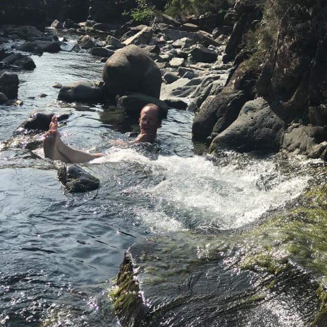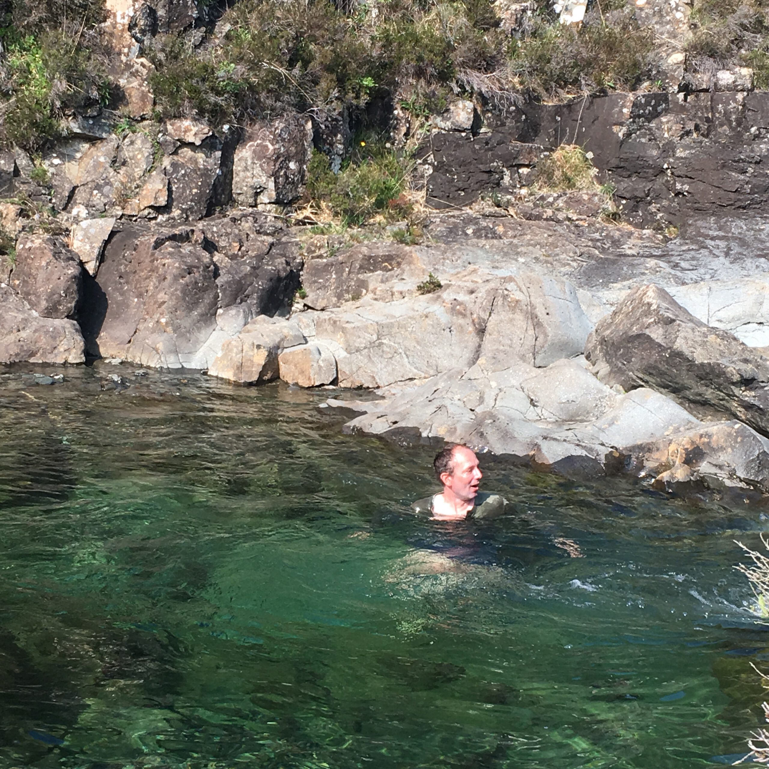 This Friday, Shree – a client from Chicago – and I headed up from the Glen Brittle Youth Hostel, ascending via a good path by a mountain stream called Allt a’ Choire Ghreadaidh. It was a warm, sunny day with little wind, and the beautiful, clear pools in the stream looked very enticing. I spotted a bathtub-shaped pool that would be great for a cooling dip on the way down.