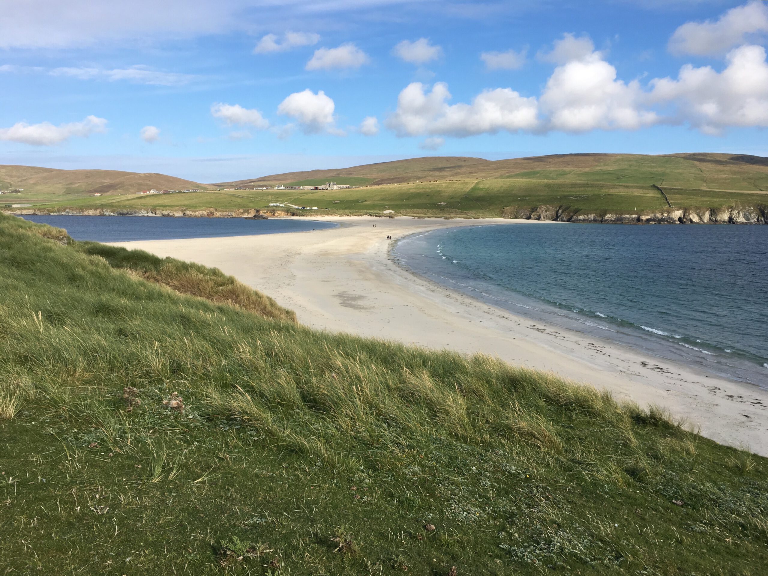 Banna Minn – or ‘Minn’ for short – is another Shetland favourite, located in West Burra, only a 20-minute drive from Lerwick. The beach is a tombolo, a sandy isthmus created through wave action, connecting West Burra to Kettle Ness. The western side is composed of beautiful white sand. The eastern side has lots of flat, oval-shaped, grey, schist pebbles, fantastic for skimming. Minn’s turquoise waters are relatively sheltered, and the beach shelves gently, making it a great place to swim. The beach can be accessed from a small car park close by. For added interest, walk to the end of the beach and explore Kettle Ness, an uninhabited peninsula with amazing birdlife. It’s a particularly good place to see Arctic Skuas.