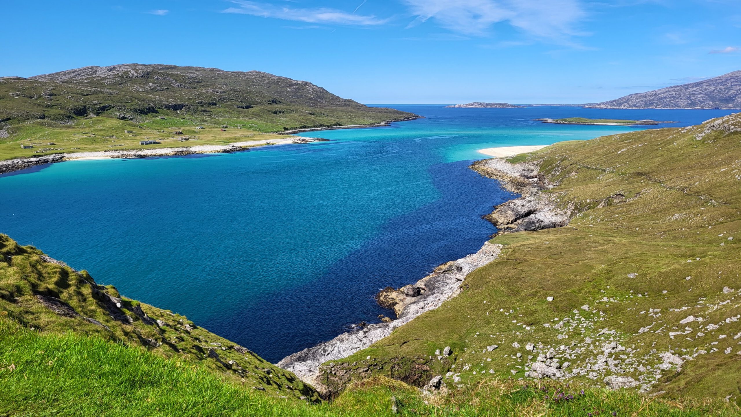 The next beach on my list is actually two adjacent beaches in North Harris, Traigh Mheilein and Loch Crabhadail beach. For me, Harris is the most beautiful place in Scotland. Its beaches are famous for their turquoise waters, deep blues and greens reminiscent of the Caribbean. These beaches are pretty remote and involve some hiking to get to. At the end of a long, windy single-track road in North Harris is a place called Huisinis. It has a fine beach, a car park, and thanks to the community-owned North Harris Estate, toilets and a picnic area. Stopping here for a visit to Huisinis is well worth the drive; the beach and the views are splendid. A bit further on, however, are two even better beaches. I visited these beaches very recently, in July 2022, with six American clients. We walked to Crabhadail beach first, a two-hour walk on a very rough path. The beach feels really remote and little visited. Big rugged hills surround it, home to sea eagles and red deer. Above the white sandy beach is a lovely grassy meadow with lazy-beds, old cultivation ridges used to grow potatoes and other crops long ago. On our way back, we visited another beach called Traigh Mheilein, which is opposite the uninhabited island of Scarp. The turquoise water lying between Traigh Mheilinn and Scarp is stunning, a wonderful place to swim, kayak, and paddleboard.