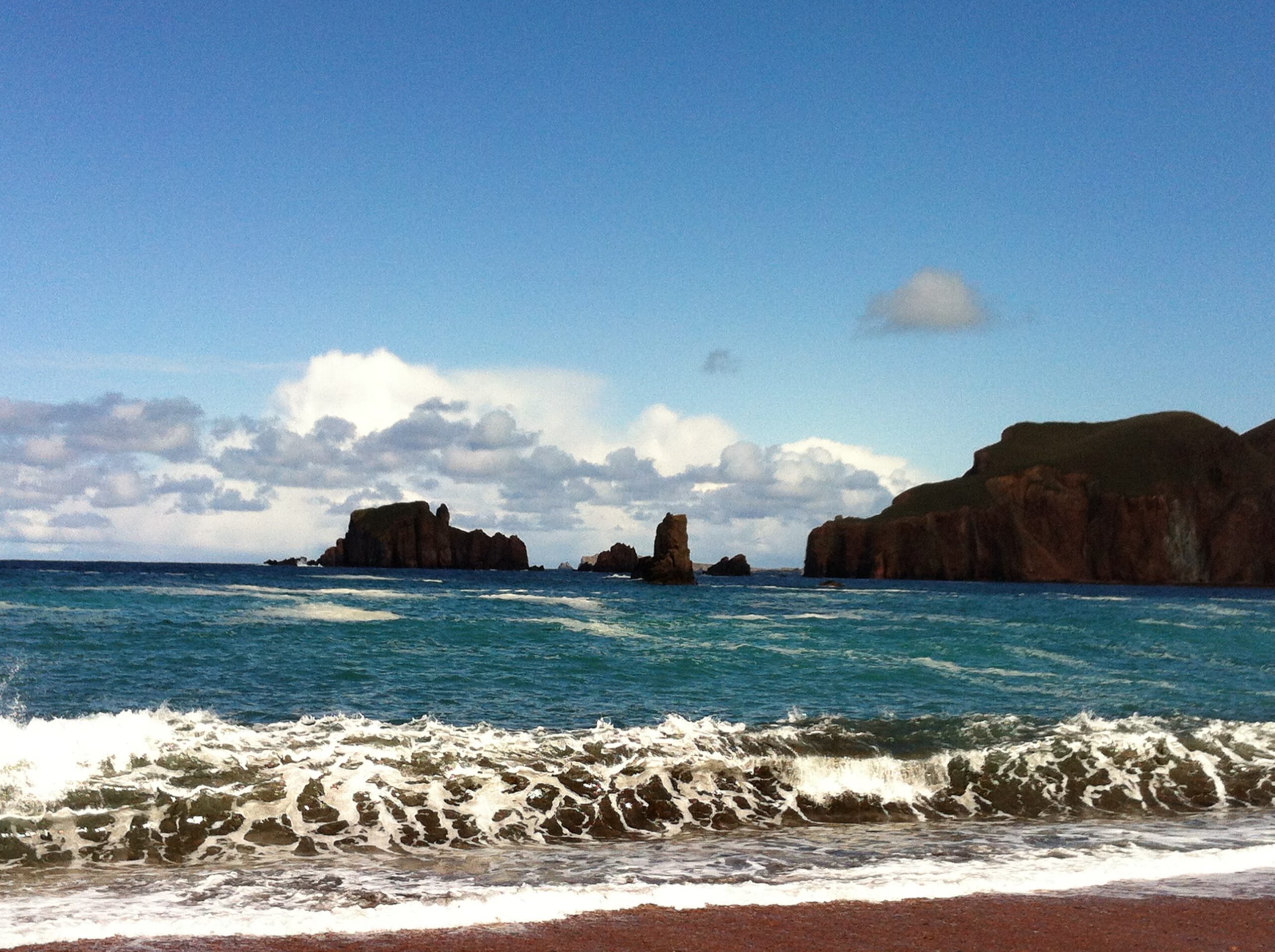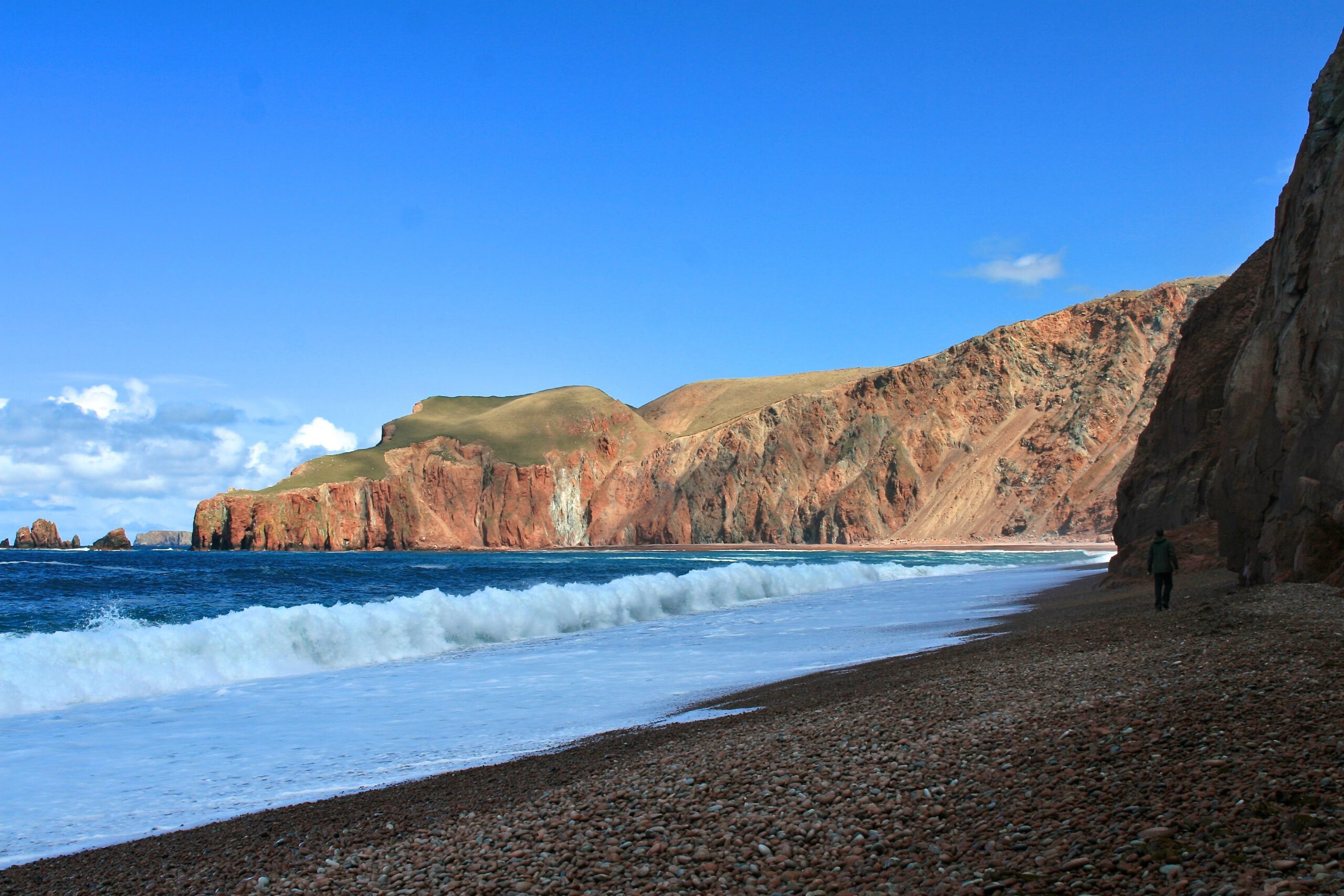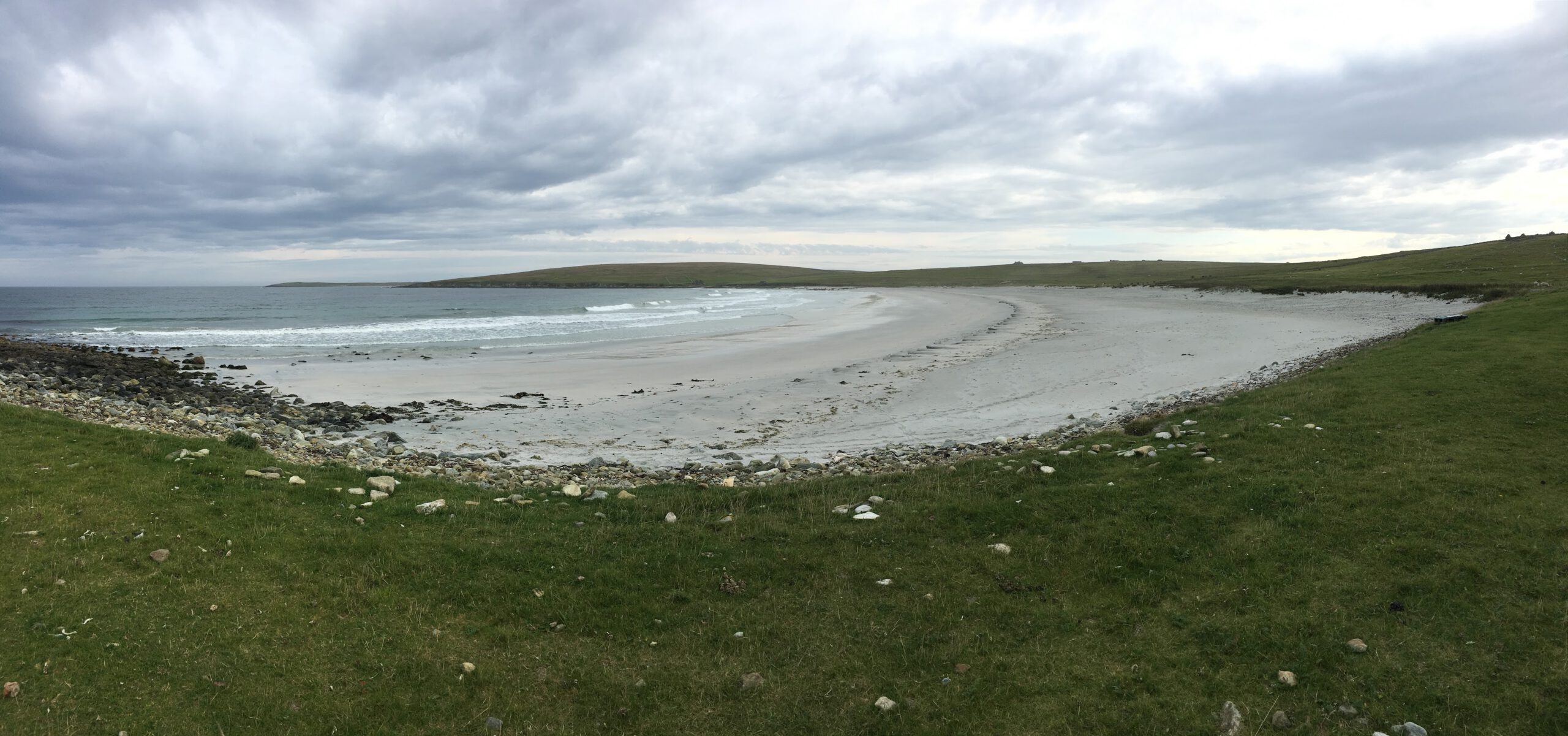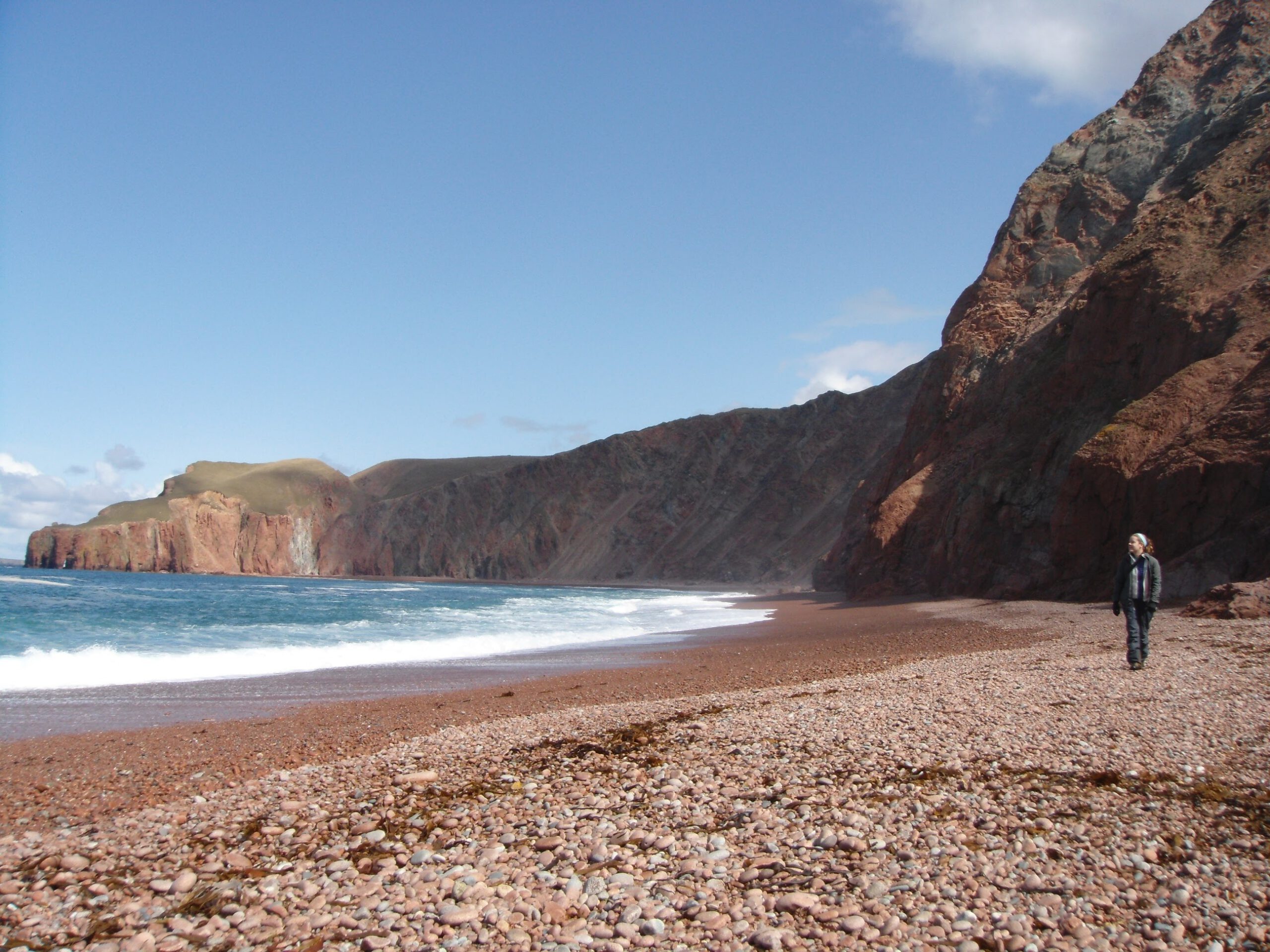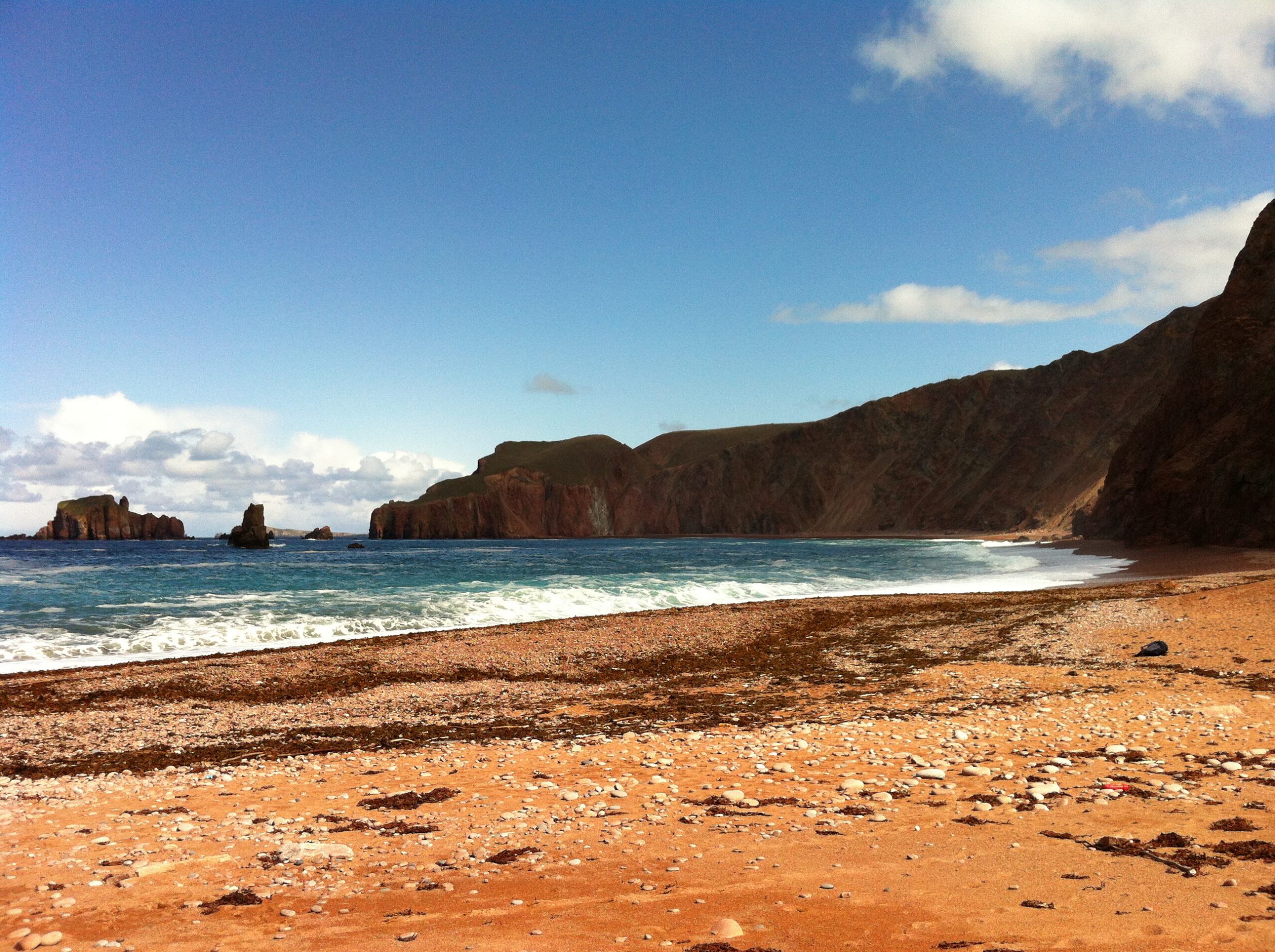 Da Lang Ayre, means the long beach. It is certainly the hardest beach to get to on this list. In the northwest of Shetland, in Northmavine, lies Shetland’s highest hill, Ronas Hill (450m). The landscape of Ronas Hill is very like the Cairngorm mountains and geologically is composed of the same rocks, Devonian granites formed during the Caledonian orogeny (mountain-building) period. Da Lang Ayre lies immediately to the west of Ronas Hill. The beach lies at the bottom of 250m sloping cliffs, eroded from the western flank of Ronas hill. To reach the beach, you need to clamber down a gully, where the cliffs are at their smallest. An in-situ rope provides a small amount of protection as you skid down the precarious slopes. Once down at the beach, breathing a sigh of relief, you are presented with an awesome view. A long, curving, steeply shelving beach stretches out before you, with massive cliffs above. Large waves crash on a beach composed of large smooth granite pebbles, mostly pink and white in colour. This would be a dangerous place to swim, with big waves, strong currents, very remote and a long way from any help. All this adds to the drama and splendour of the beach. On one visit, back in 2012, I saw a sea eagle, high above the cliffs. Sea eagles were reintroduced to the west coast of Scotland in the 1980s after the last bird was shot in Shetland in the 1920s. It may be, however, that the bird I saw came from Norway, flying 300 miles across the North Sea to hunt.