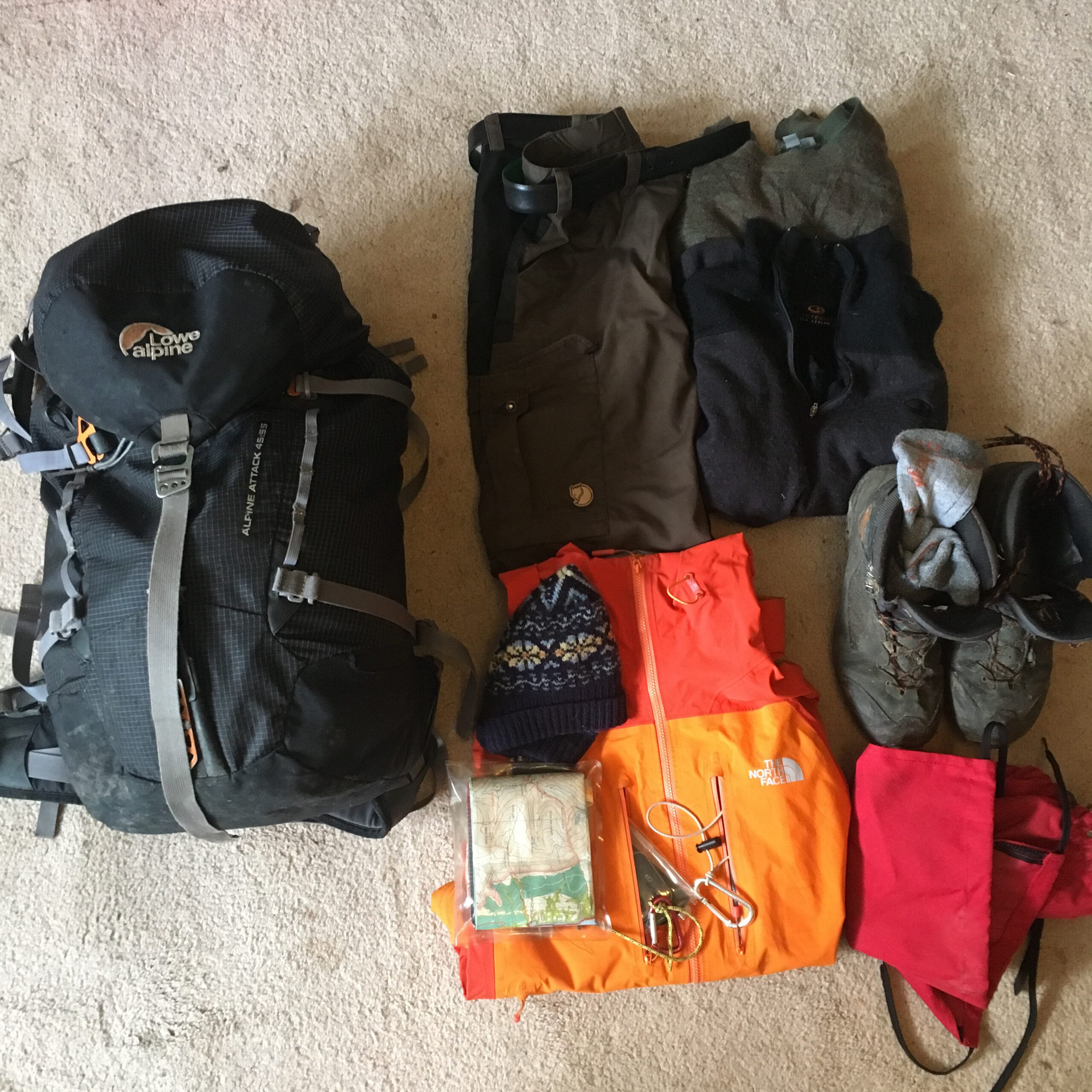 This photo groups my kit into stuff I will wear, including the kit I will have in my pockets (like map and compass and phone); stuff in the main compartment of my Rucksack; stuff in the top lid pocket of my Rucksack; and walking poles.